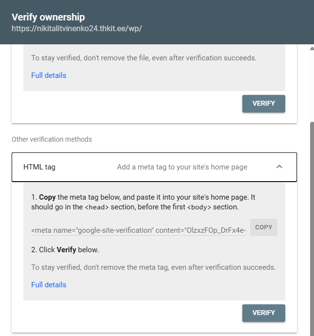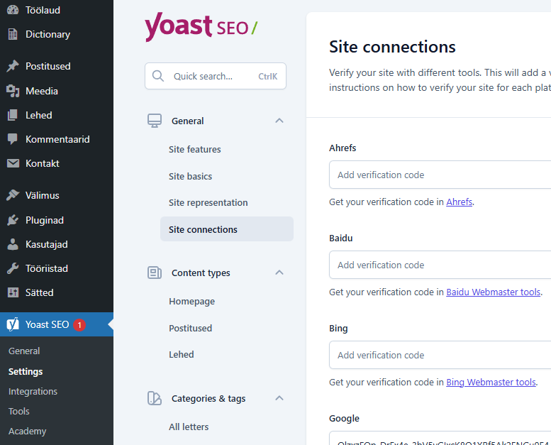 - SEO plugini seadistused, kasutame verifitseerimiseks Google Search Konsooli